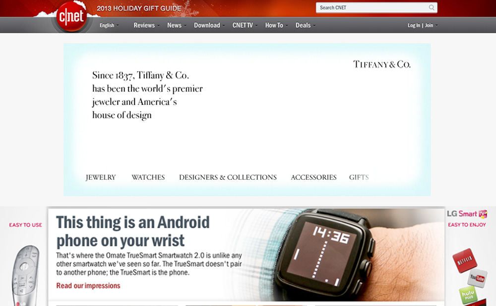 Tiffany & Co. is a prestigious and refined company. Therefore I tried going for a minimalist approach for the banner, adding a subtle shine effect to display it's presence. I designed the banners with Adobe Flash and implemented it in a webpage using screen shots of cnet.com and Adobe Dreamweaver.